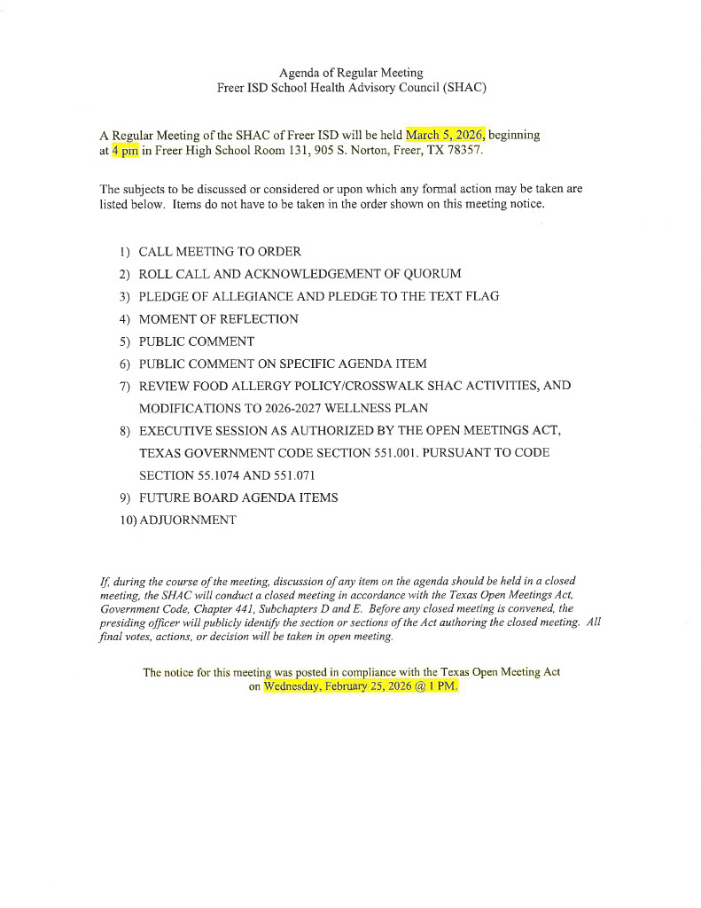 As per Texas law, SB 12, any medical treatment provided by Freer ISD must require a consent. Below is the link for your Freer ISD student(s), without this consent signed, your student will not receive any medical interventions unless it is a medical emergency. A consent form must be completed for each student enrolled at Freer ISD.